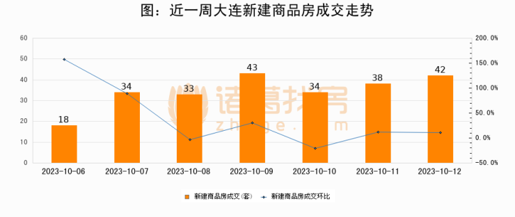 根据大连市住房保障和房屋管理局数据显示,2023年10月12日大连新建商品房成交42套,较昨日增加4套,环比上涨10.5%