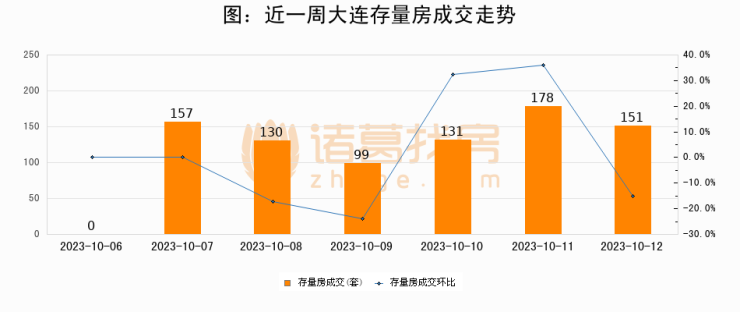 从存量房来看,2023年10月12日大连存量房单日成交151套,比昨日减少27套,环比下降15.2%。从近一周存量房成交来看,大连存量房日均成交套数为120套,10月12日单日成交151套,高于近一周平均水平25.8%。
