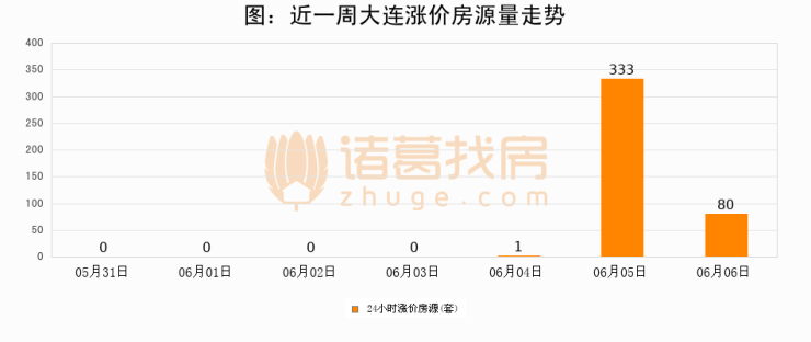 根据诸葛找房数据显示,大连24小时涨价房源量为80套,较06月05日减少253套,环比下降76%。与此同时,涨价房源占比小幅回落,对于购房者来说是一个入市窗口期,购房者可抓住时机入市。
