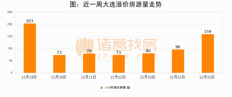 根据诸葛找房数据显示,大连24小时涨价房源量为159套,较12月24日增加63套,环比上涨65.6%。与此同时,涨价房源占比小幅扩大,业主信心有所提升。