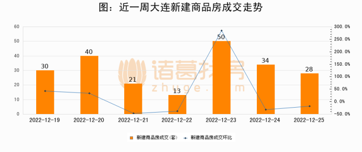 根据大连市住房保障和房屋管理局数据显示,2022年12月25日大连新建商品房成交28套,较昨日减少6套,环比下降17.6%