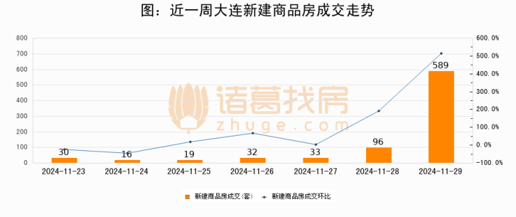 根据大连市住房保障和房屋管理局数据显示,2024年11月29日大连新建商品房成交589套,较昨日增加493套,环比上涨513.5%