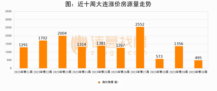 从调价房源来看,第30周大连涨价房源495套,较上周下降63.5%。与此同时,30周涨价房源占比回落0.72个百分点,业主信心小幅波动,购房者可则需入市。