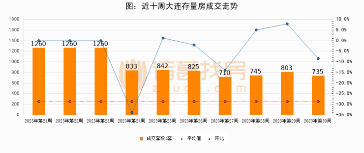 存量房方面,第30周大连存量房成交735套,较上周减少68套,环比下降8.5%。从近十周成交走势来看,周均成交套数为927套,本周低于平均水平20.7%。