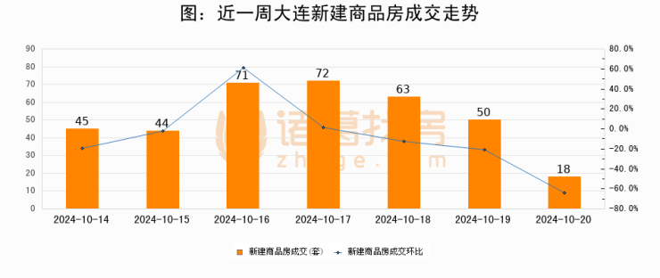 根据大连市住房保障和房屋管理局数据显示,2024年10月20日大连新建商品房成交18套,较昨日减少32套,环比下降64%