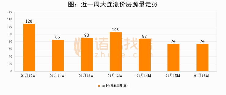 根据诸葛找房数据显示,大连24小时涨价房源量为74套,较01月15日持平。