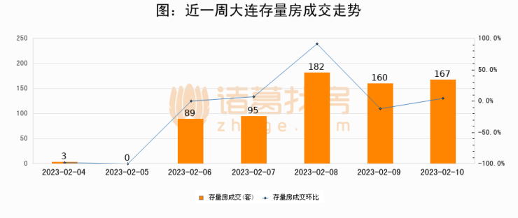 从存量房来看,2023年02月10日大连存量房单日成交167套,比昨日增加7套,环比上涨4.4%。从近一周存量房成交来看,大连存量房日均成交套数为99套,其中02月08日成交量最高为182套,02月10日单日成交167套,高于近一周平均水平68.7%。