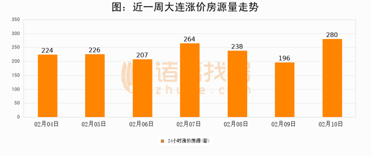 根据诸葛找房数据显示,大连24小时涨价房源量为280套,较02月09日增加84套,环比上涨42.9%。与此同时,涨价房源占比小幅扩大,业主信心有所提升。