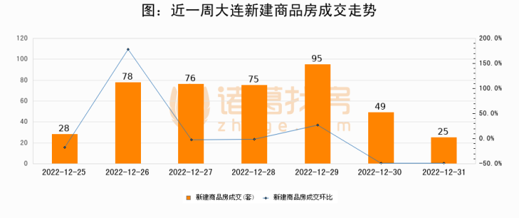 根据大连市住房保障和房屋管理局数据显示,2022年12月31日大连新建商品房成交25套,较昨日减少24套,环比下降49%