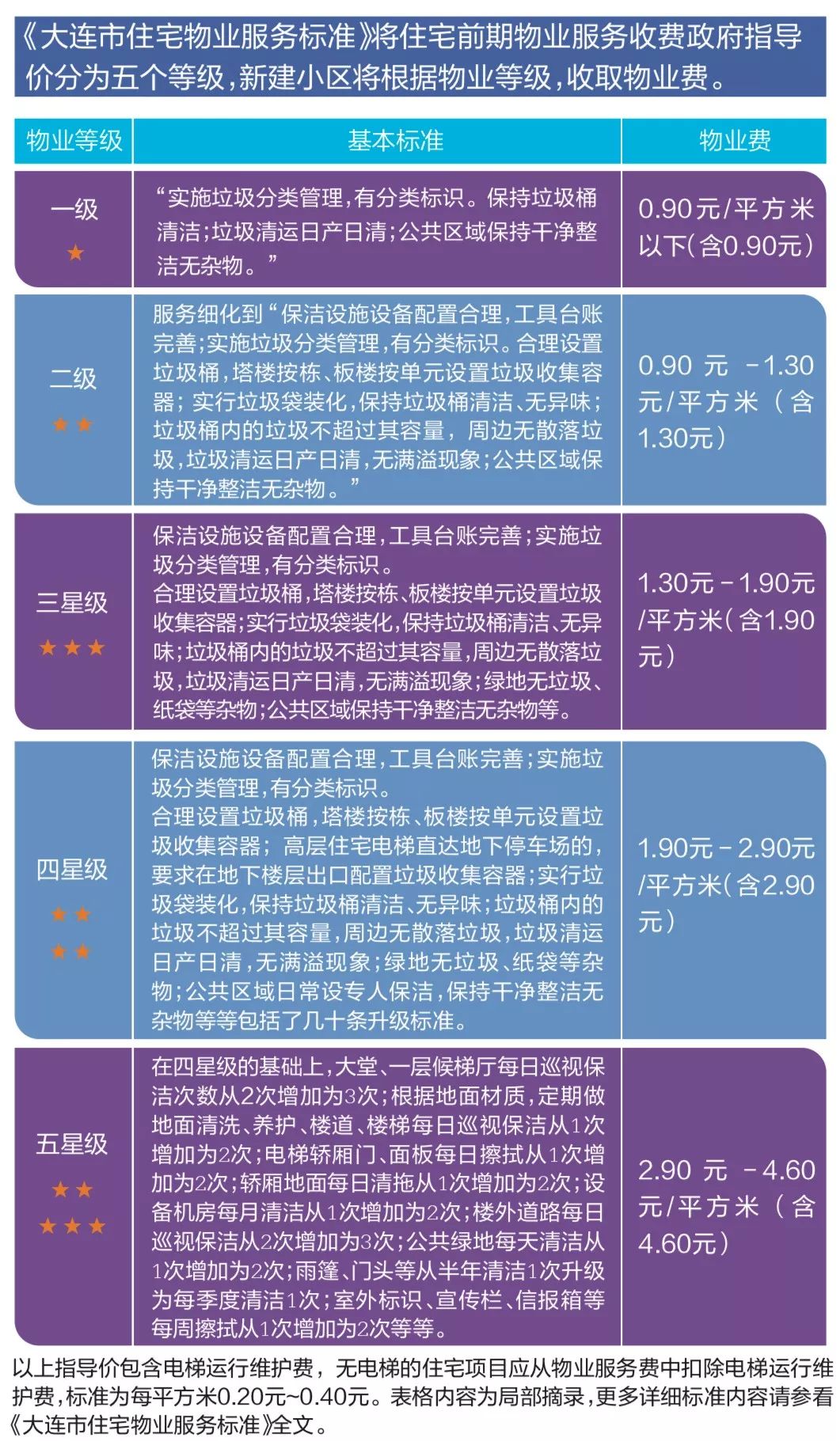 《大连市住宅物业服务标准》将住宅前期物业服务收费政府指导价分为五个等级,新建小区将根据物业等级,收取物业费。