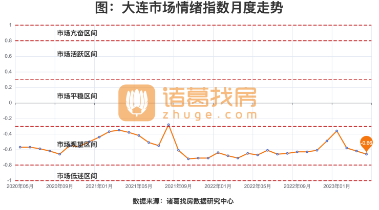 根据诸葛找房数据研究中心监测数据显示,2023年04月,大连市场情绪指数为-0.66,较上月下降0.04,位于市场观望区间。