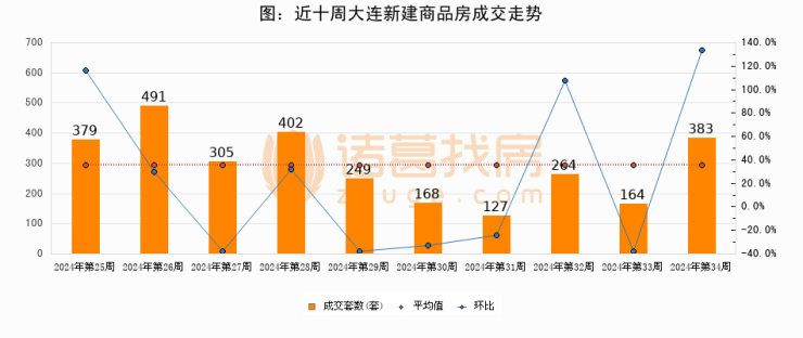 进入2024年第34周(08月19日-08月25日),大连新建商品房成交383套,较上周增加219套,环比上涨133.5%。从近十周成交来看,周均成交套数为293套,本周成交383套,高于近十周平均成交量30.7%。