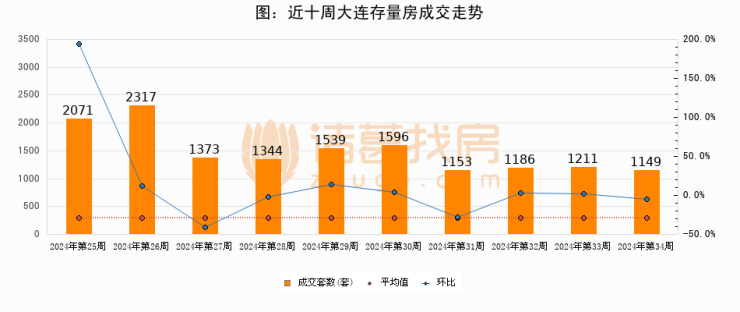 存量房方面,第34周大连存量房成交1149套,较上周减少62套,环比下降5.1%。从近十周成交走势来看,周均成交套数为1493套,本周低于平均水平23%。