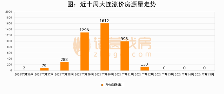 从调价房源来看,第45周大连涨价房源0套,较上周持平。与此同时,45周涨价房源占比回落100个百分点,业主信心小幅波动,购房者可则需入市。