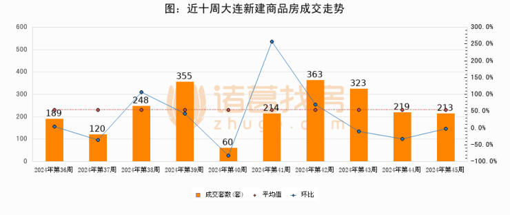 进入2024年第45周(11月04日-11月10日),大连新建商品房成交213套,较上周减少6套,环比下降2.7%
