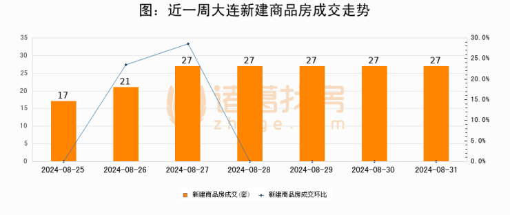 根据大连市住房保障和房屋管理局数据显示,2024年08月31日大连新建商品房成交27套,较昨日持平