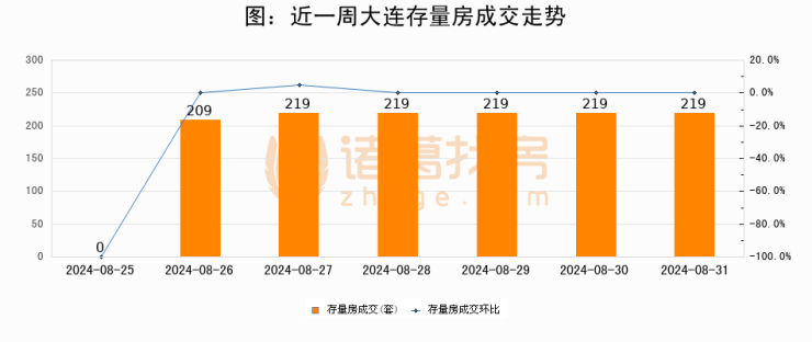 从存量房来看,2024年08月31日大连存量房单日成交219套,比昨日持平。。从近一周存量房成交来看,大连存量房日均成交套数为186套,08月31日单日成交219套,高于近一周平均水平17.7%。