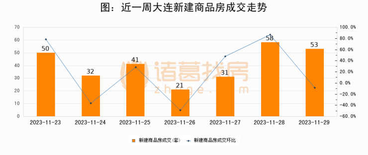 根据大连市住房保障和房屋管理局数据显示,2023年11月29日大连新建商品房成交53套,较昨日减少5套,环比下降8.6%