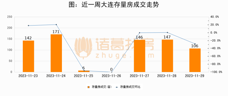 从存量房来看,2023年11月29日大连存量房单日成交106套,比昨日减少41套,环比下降27.9%。从近一周存量房成交来看,大连存量房日均成交套数为102套,11月29日单日成交106套,高于近一周平均水平3.9%。