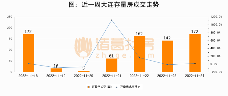 从存量房来看,2022年11月24日大连存量房单日成交172套,比昨日增加30套,环比上涨21.1%。从近一周存量房成交来看,大连存量房日均成交套数为104套,其中11月18日成交量最高为172套,11月24日单日成交172套,高于近一周平均水平65.4%。