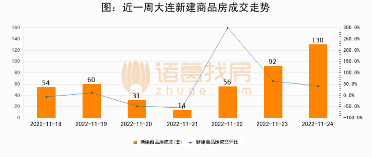 根据大连市住房保障和房屋管理局数据显示,2022年11月24日大连新建商品房成交130套,较昨日增加38套,环比上涨41.3%