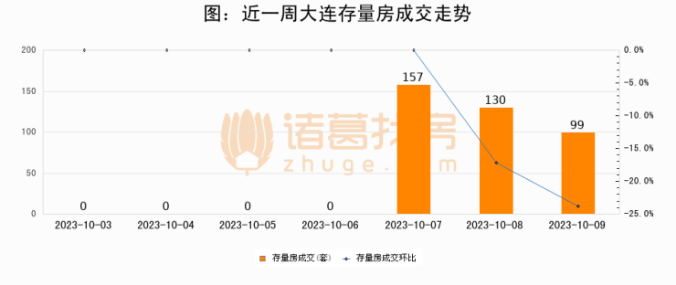 从存量房来看,2023年10月09日大连存量房单日成交99套,比昨日减少31套,环比下降23.8%。从近一周存量房成交来看,大连存量房日均成交套数为55套,10月09日单日成交99套,高于近一周平均水平80%。