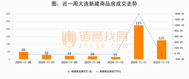根据大连市住房保障和房屋管理局数据显示,2024年11月12日大连新建商品房成交125套,较昨日减少100套,环比下降44.4%