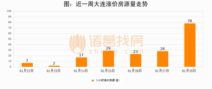 根据诸葛找房数据显示,大连24小时涨价房源量为78套,较01月27日增加50套,环比上涨178.6%。与此同时,涨价房源占比小幅扩大,业主信心有所提升。