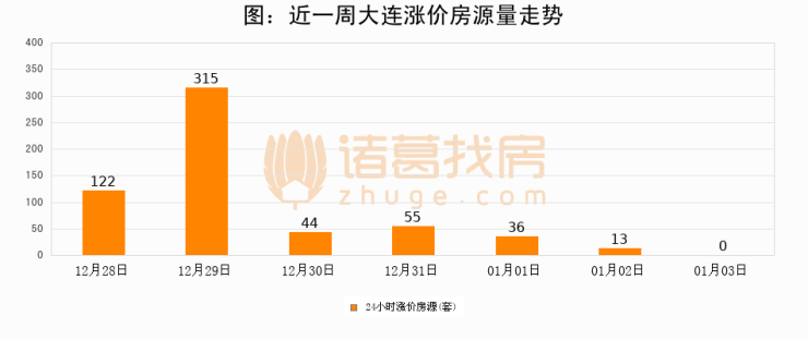 根据诸葛找房数据显示,大连24小时涨价房源量为0套,较01月02日减少13套,环比下降100%。与此同时,涨价房源占比小幅回落,对于购房者来说是一个入市窗口期,购房者可抓住时机入市。