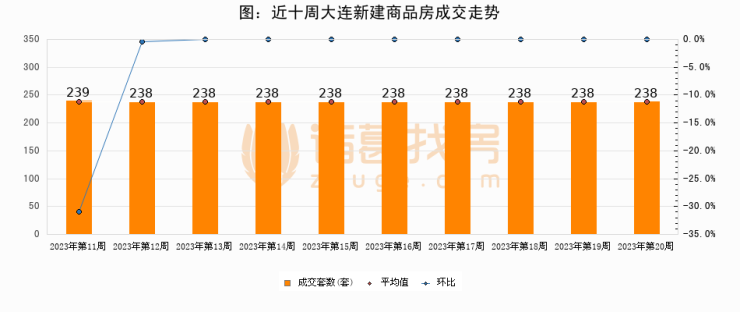 进入2023年第20周(05月08日-05月14日),大连新建商品房成交238套,较上周持平