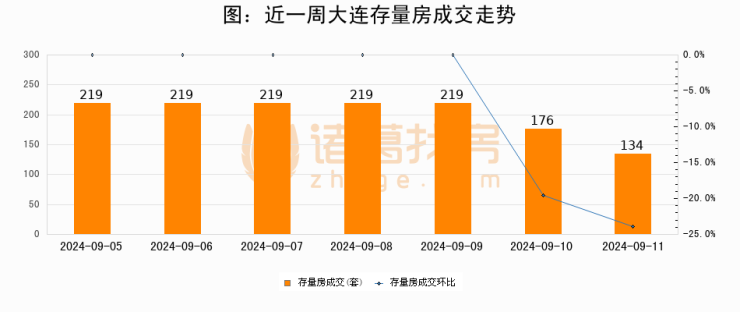 从存量房来看,2024年09月11日大连存量房单日成交134套,比昨日减少42套,环比下降23.9%。从近一周存量房成交来看,大连存量房日均成交套数为200套,09月11日单日成交134套,低于近一周平均水平33%。