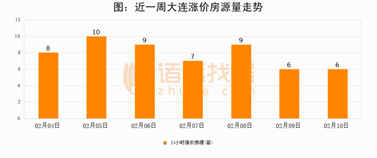 根据诸葛找房数据显示,大连24小时涨价房源量为6套,较02月09日持平。