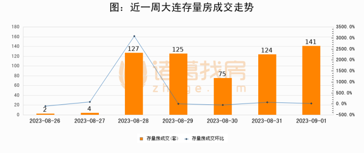 从存量房来看,2023年09月01日大连存量房单日成交141套,比昨日增加17套,环比上涨13.7%。从近一周存量房成交来看,大连存量房日均成交套数为85套,09月01日单日成交141套,高于近一周平均水平65.9%。
