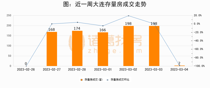 从存量房来看,2023年03月04日大连存量房单日成交2套,比昨日减少196套,环比下降99%。从近一周存量房成交来看,大连存量房日均成交套数为129套,其中03月02日成交量最高为198套,03月04日单日成交2套,低于近一周平均水平98.4%。