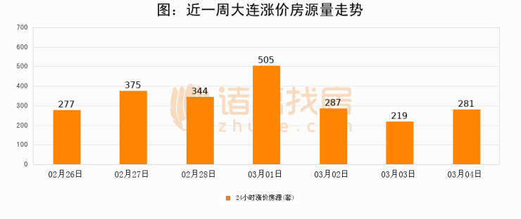 根据诸葛找房数据显示,大连24小时涨价房源量为281套,较03月03日增加62套,环比上涨28.3%。与此同时,涨价房源占比小幅扩大,业主信心有所提升。