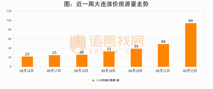 根据诸葛找房数据显示,大连24小时涨价房源量为94套,较09月21日增加45套,环比上涨91.8%。与此同时,涨价房源占比小幅扩大,业主信心有所提升。