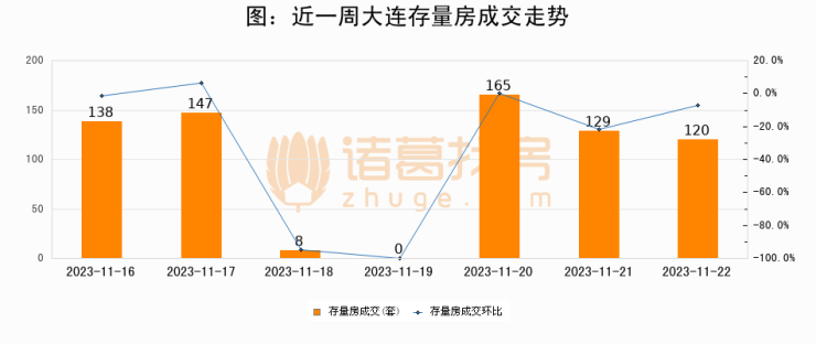 从存量房来看,2023年11月22日大连存量房单日成交120套,比昨日减少9套,环比下降7%。从近一周存量房成交来看,大连存量房日均成交套数为101套,11月22日单日成交120套,高于近一周平均水平18.8%。