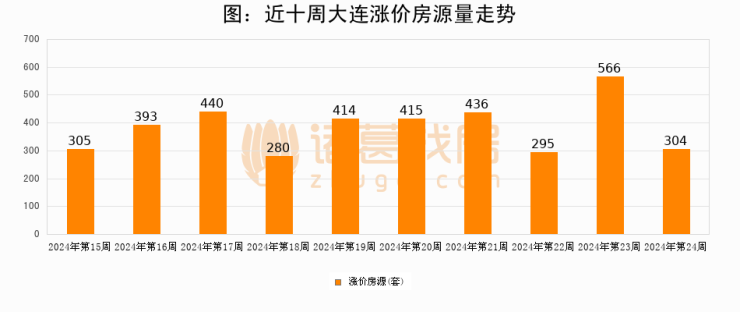 从调价房源来看,第24周大连涨价房源304套,较上周下降46.3%。与此同时,24周涨价房源占比回落1.35个百分点,业主信心小幅波动,购房者可则需入市。
