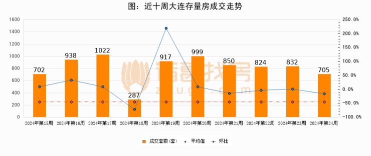 存量房方面,第24周大连存量房成交705套,较上周减少127套,环比下降15.3%。从近十周成交走势来看,周均成交套数为807套,本周低于平均水平12.6%。