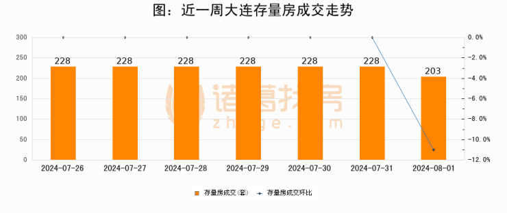 从存量房来看,2024年08月01日大连存量房单日成交203套,比昨日减少25套,环比下降11%。从近一周存量房成交来看,大连存量房日均成交套数为224套,08月01日单日成交203套,低于近一周平均水平9.4%。