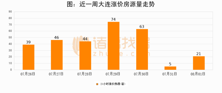 根据诸葛找房数据显示,大连24小时涨价房源量为21套,较07月31日增加16套,环比上涨320%。与此同时,涨价房源占比小幅扩大,业主信心有所提升。