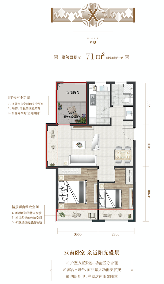 建面约71㎡ 两室两厅一卫